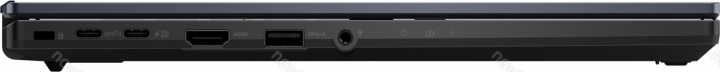 - 1x HDMI, 1x USB-C 3.1 with DisplayPort (10Gb/s, mains connection), 1x USB-C 3.1 (10Gb/s, mains connection), 1x USB-A 2.0 (480Mb/s), 1x Gb LAN, 1x jack