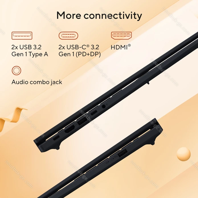 2x USB-C 3.0 с DisplayPort 1.2 (5Gb/s, PD-Out 65W, сетевой разъём питания PD-In), 2x USB-A 3.0 (5Gb/s), 1x HDMI 2.1 TMDS, 1x 3.5 мм аудио-разъём