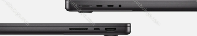 - 3x Thunderbolt 4 / USB4 с DisplayPort 1.4 (40Gb/s, PD-Out, сетевой разъём питания PD-In), 1x HDMI 2.1, 1x 3.5 мм аудио-разъём, 1x SD Card, 1x DC-In Apple MagSafe 3 (сетевой разъём)