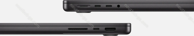 - 3x Thunderbolt 5 / USB4 v2 с DisplayPort 2.1 UHBR20 (80Gb/s, сетевой разъём питания PD-In), 1x HDMI 2.1, 1x 3.5 мм аудио-разъём, 1x SD Card, 1x DC-In Apple MagSafe 3 (сетевой разъём)