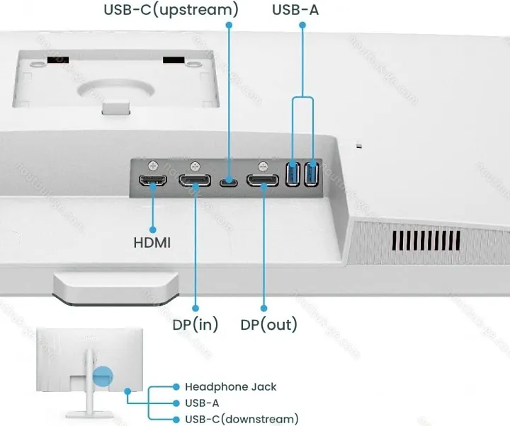 - 1x USB-C with DisplayPort 1.2 (Upstream, PD 65W, 75Hz@2560x1440), 1x HDMI 1.4 (60Hz@2560x1440), 1x DisplayPort 1.2 (75Hz@2560x1440), 1x DisplayPort-Out, 1x USB-C 3.0 (downstream, 5Gb/s, BC), 3x USB-A 3.0 (downstream, 5Gb/s), 1x 3.5mm jack (Line-Out), 1x AC-In C13 (mains connection)