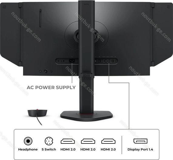 - 1x DisplayPort 1.4 (400Hz@1920x1080), 3x HDMI 2.0 (400Hz@1920x1080), 1x USB micro-B (Fernbedienungs connector), 1x 3.5mm jack выход на наушники, 1x AC-In C14 (подключение к электросети)