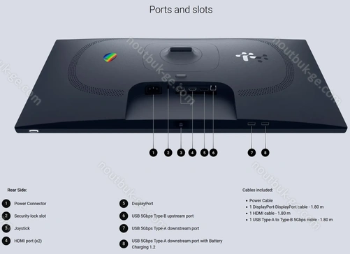 - 1x DisplayPort 1.4 (HDCP 2.3, 180Hz@2560x1440), 2x HDMI 2.1 (HDCP 2.3, 144Hz@2560x1440), 1x USB-B 3.0 (исходящий, 5Gb/s), 1x USB-A 3.0 (входящий, 5Gb/s, BC), 1x USB-A 3.0 (входящий, 5Gb/s), 1x AC-In C14 (подключение к электросети)