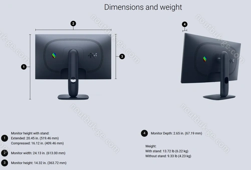- 613x409.5x206mm (ШxВxГ) с опущенной подставкой, 613x519.5x206mm (ШxВxГ) с поднятой подставкой, 613x363.7x67.2mm (ШxВxГ) без подставки