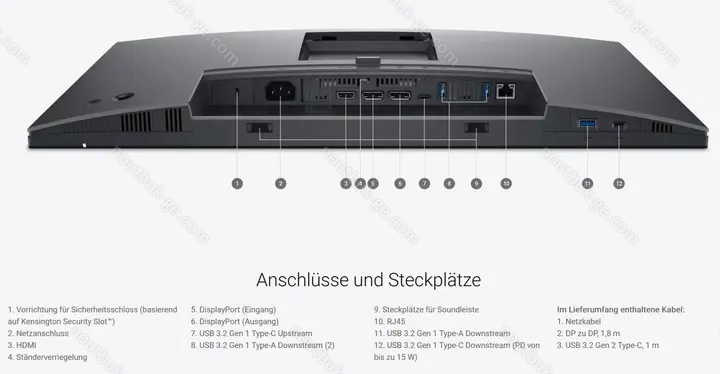 - 1x HDMI 1.4 (HDCP 1.4, 100Hz@1920x1080), 1x DisplayPort 1.4 (HDCP 1.4, 100Hz@1920x1080), 1x DisplayPort-Out 1.4, 1x USB-C 3.1 with DisplayPort 1.4 (Upstream, 10Gb/s, PD 90W, 100Hz@1920x1080), 1x USB-C 3.0 (downstream, 5Gb/s, PD 15W), 3x USB-A 3.0 (downstream, 5Gb/s), 1x RJ-45 1Gb LAN, 1x AC-In C13 (mains connection)