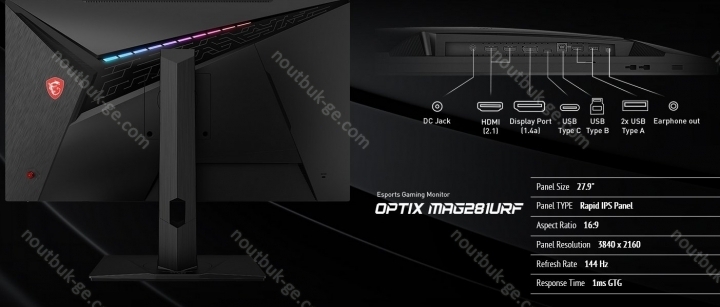 - 2x HDMI 2.1 (144Hz@3840x2160), 1x DisplayPort 1.4a (144Hz@3840x2160), 1x USB-C 2.0 with DisplayPort 1.4a (144Hz@3840x2160)