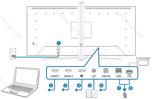 - 1x DisplayPort 1.4 (HDCP 2.2, 180Hz@3440x1440), 2x HDMI 2.0 (HDCP 2.2, 100Hz@3440x1440), 1x USB-B 3.0 (исходящий, 5Gb/s), 1x USB-A 3.0 (входящий, 5Gb/s, BC), 2x USB-A 3.0 (входящий, 5Gb/s), 1x 3.5mm jack выход на наушники, 1x AC-In C14 (подключение к электросети)
